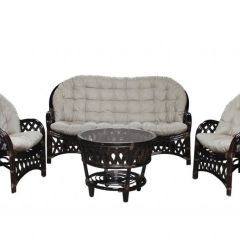 Комплект из натурального ротанга, состоящий из дивана, двух кресел и круглого столика со стеклом.